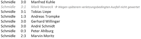 Mit einer soliden Leistung qualifizierte sich am Sonntag Vormittag (03.03.13) der einzige Vertreter der SG Einheit Sebastian Schmidle bei der Vorrunde des Kreisranglistenturniers für die Hauptrunde am 17.03. Insgesamt holte er 8:6 Punkte (15:10 Sätze) und damit den 4. Platz, der ihn für den Hauptausscheid qualifiziert.