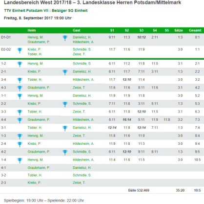 Im ersten Einzel fand Schmidle gegen einen starken Gegner nicht ins Spiel. Der Potsdamer Maik Herwig schlug ihn verdient mit 3:1. Danielisz gewann nach vier Sätzen gegen die heutige Nummer 2 Philipp Krebs, der sonst in der neunten Mannschaft Potsdams spielt. Auch Schmidle gewann dann gegen Krebs, während auch Danielisz seinen Meister in Herwig fand. Zeise und Hildesheim konnten an diesem Tag kein Match gewinnen, beide zeigten Unsicherheiten in sonstigen Stärken. So konnten im unteren Paarkreuz nur Danielisz gegen Henry Tobler und Schmidle gegen Paula Graubmann (beide in der zehnten Mannschaft gemeldet) je einen Punkt zum 10:5-Endstand erzielen.