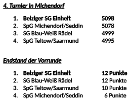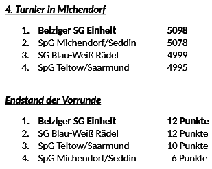 Zum Abschluss der Vorrunde in der Kegel-Kreisliga ging es für die Kegelsportfreunde der Belziger SG Einheit nach Michendorf. Wollte man einen der begehrten 2 Plätze in der Gesamtwertung belegen,